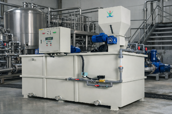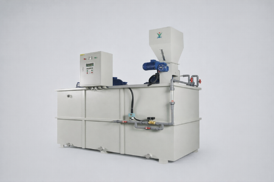干粉经螺旋送料机定量投加至溶药罐,与水流混合形成溶液,经搅拌均匀后进入储液罐。系统通过液位与流量传感器自动控制投加量,确保溶液浓度稳定。